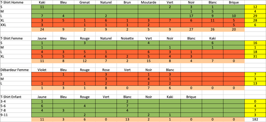Kaki, bleu, moutarde, grenat, naturel, brun, vert, noir, blanc, brique